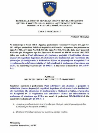 Ministria e Kulturës, Rinisë dhe Sportit i ka pezulluar procedurat e prokurimit për projektin e ndërtimit dhe rinovimit të Stadiumit të Gjilanit.