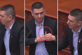 Deputeti shqiptar në Maqedoni me flamur kombëtar në kostum, qortohet nga kryeministri Mick...