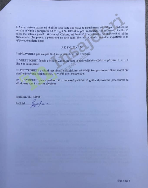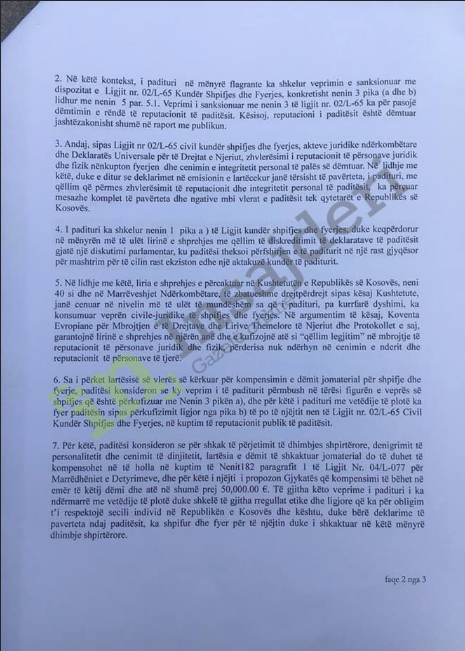“Paditësi konsideron se për shkak të përjetimit të dhimbjes shpirtërore, denigrimit të personalitetit dhe cenimit të dinjitetit, lartësia e dëmit të shkaktuar jomaterial do të duhet të kompensohet në të holla në detyrim të ligjit për Marrëdhëniet e Detyrimeve dhe për këtë i njëjti i propozon Gjykatës që konpenzimi të bëhet në emër të këtij dëmi dhe atë në shumë prej 50 mijë euro”, thuhet në padi./Insajderi.com
