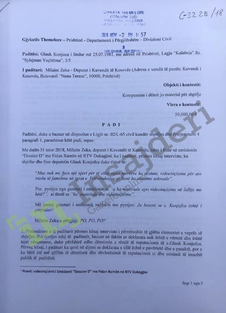 “Pretendimet e të paditurit përmes kësaj interviste i përmbushin të gjitha elementet e veprës së shpifjes dhe fyerjes ndaj të paditurit, bazuar në faktin se deklarata nuk është e vërtetë dhe është tejet nëncmuese duke përfshirë edhe dëmtimin e rëndë të reputacionit të z.Glauk Konjufca. Përveç kësaj i padituri ka qenë në dijeni se deklarata e tillë është e pavërtetë dhe e pasaktë, por e ka bërë atë me qëllim të dëmtimit dhe zhvlerësimit të reputacionit si dhe cenimit të imazhit publik të paditësit”, thuhet në padi.