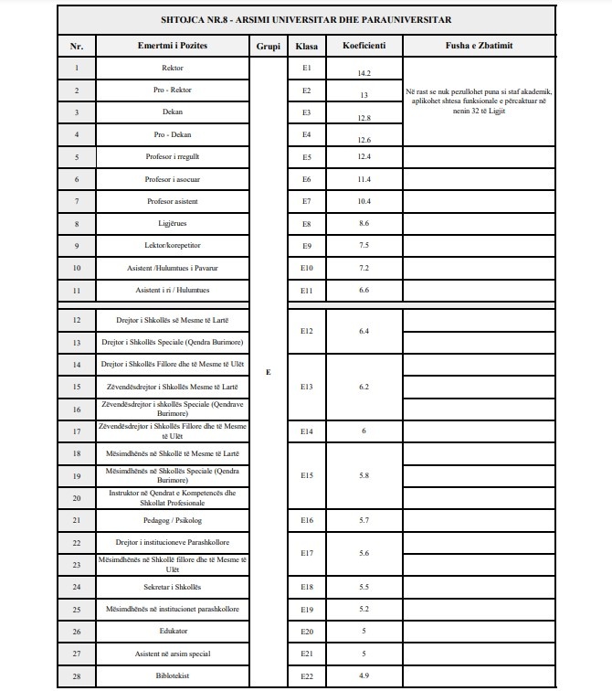 Sa i përket profesorëve, është propozuar që ata të rregullt të kenë koeficient 12.4, ata të asocuar koeficient 11.4, kurse me 10.4 janë vlerësuar profesorët asistent./arbresh.info/
