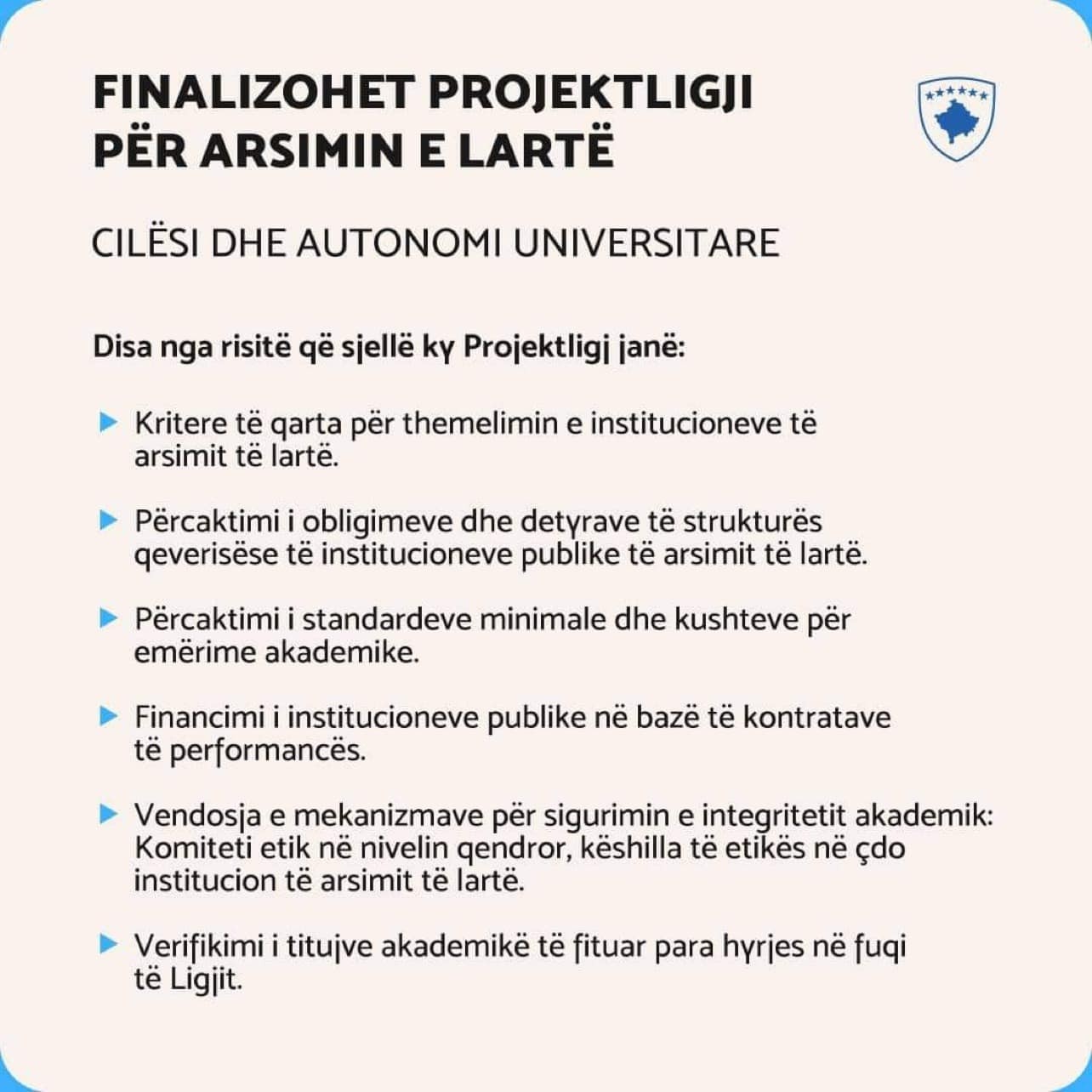 Ministrja e Arsimit, Shkencës, Teknologjisë dhe Inovacionit (MASHTI), Arbëri Nagavci ka bërë të ditur se është finalizuar Projektligji për Arsimin e lartë i cili ndër të tjera garanton cilësi dhe autonomi universitare.