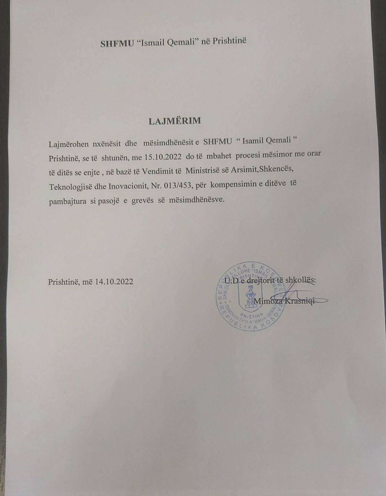 “Lajmërohen nxënësit dhe mësimdhënësit e SHFMU ‘Ismail Qemali’ Prishtinë, se të shtunën, me 15.10.2022 do të mbahet procesi mësimor me orar të ditës së enjte, në bazë të Vendimit të Ministrisë së Arsimit, Shkencës, Teknologjisë dhe Inovacionit, Nr. 013/453, për kompensimin e ditëve të pambajtura si pasojë e grevës së mësimdhënësve”, thuhet në njoftimin e publikuar nga shkolla “Ismail Qemali”, thuhet në njoftim.