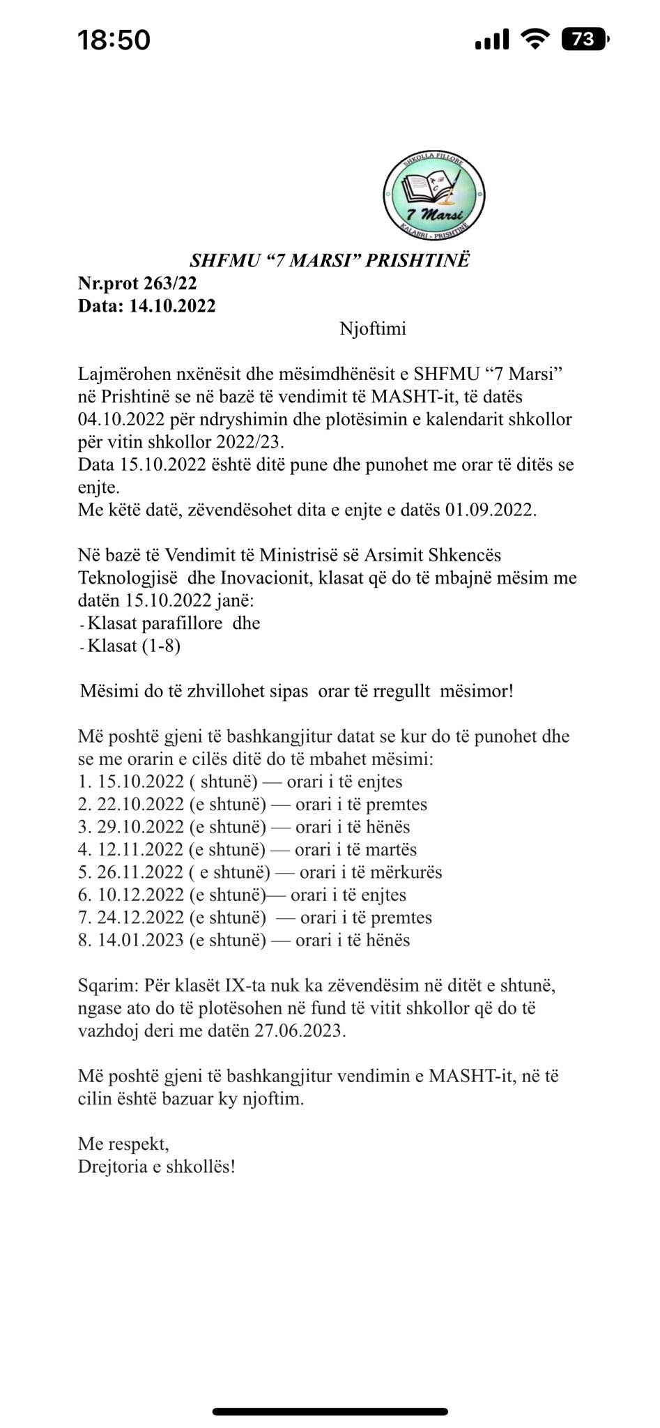 Edhe shkolla “7 Marsi”, ka njoftuar se do të mbajë mësim.