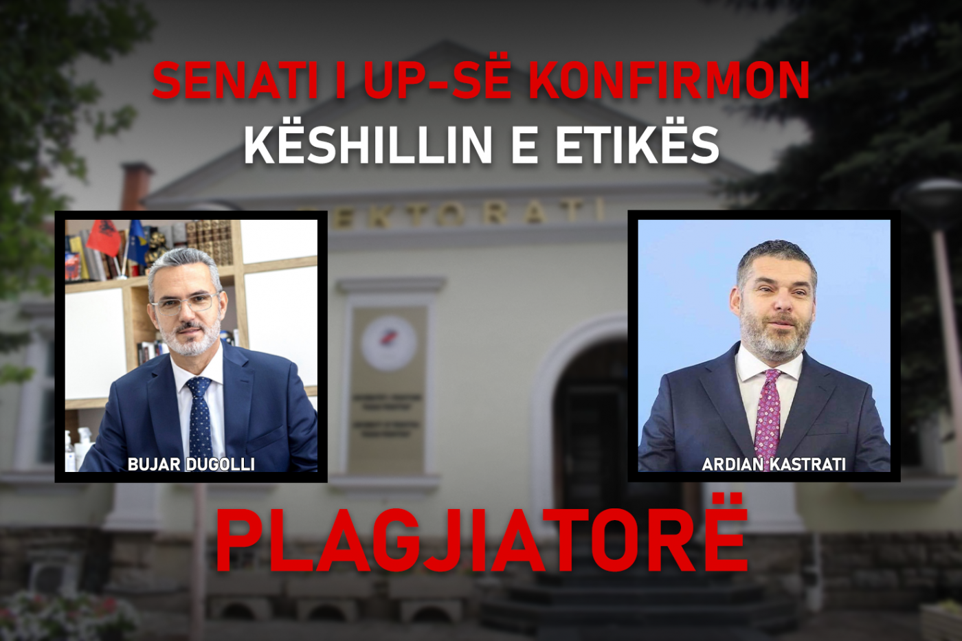 Në mbledhjen e djeshme të Senatit të Universitetit të Prishtinës (UP), në pikën e dytë të rendit të ditës, u konfirmua gjetja e Këshillit të Etikës së UP-së, e cila i shpallë plagjiatorë prof. Dr. Bujar Dugollin dhe prof. Ass. Ardian Kastratin. Kjo është bërë e ditur nga Organizata për Rritjen e Cilësisë në Arsim (ORCA).