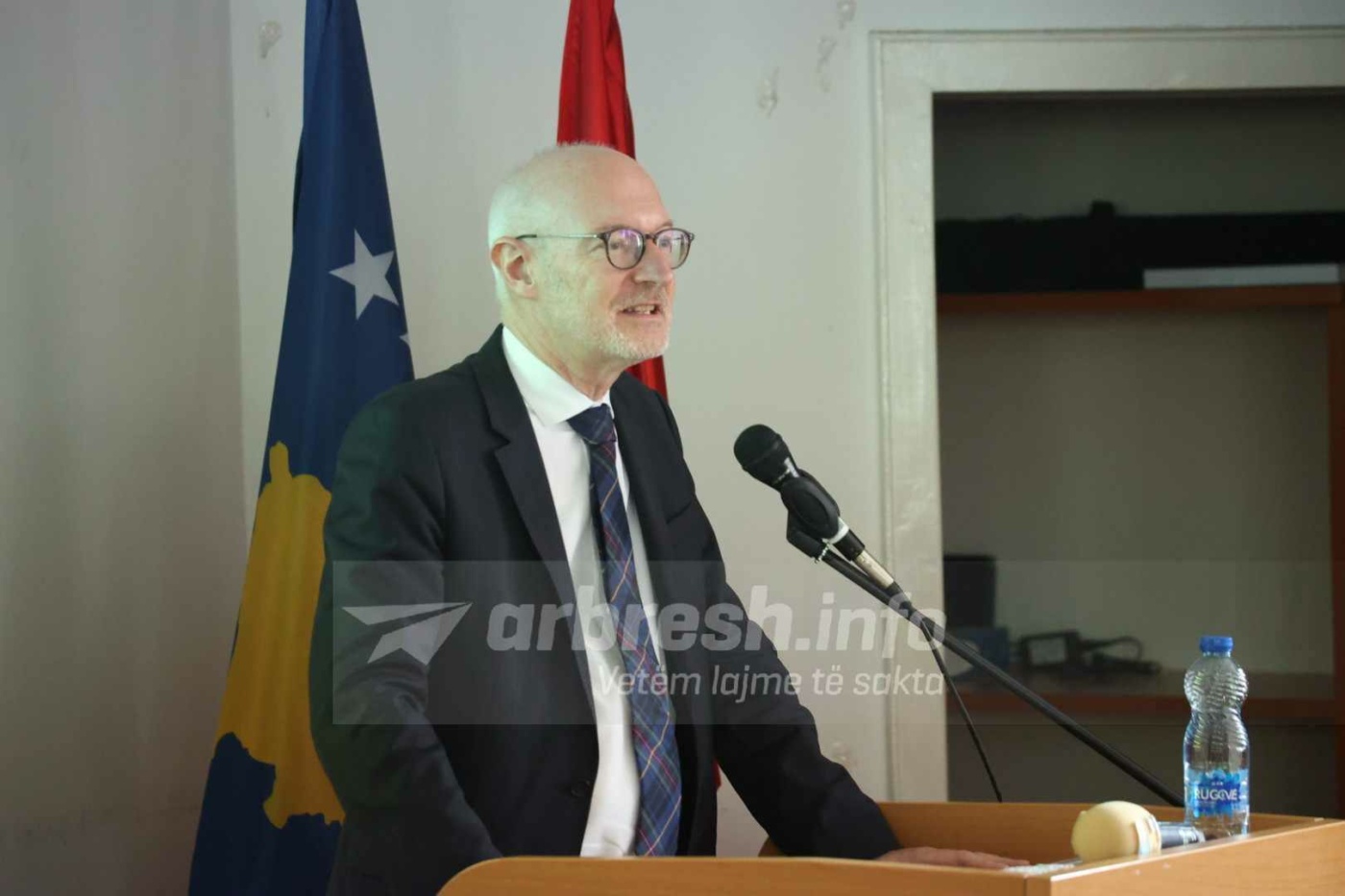 Në fjalën e tij, ai filloi fjalimin me kërkim falje që nuk flet gjuhën shqipe apo siç e quajti ai “gjuhën e Kadaresë”