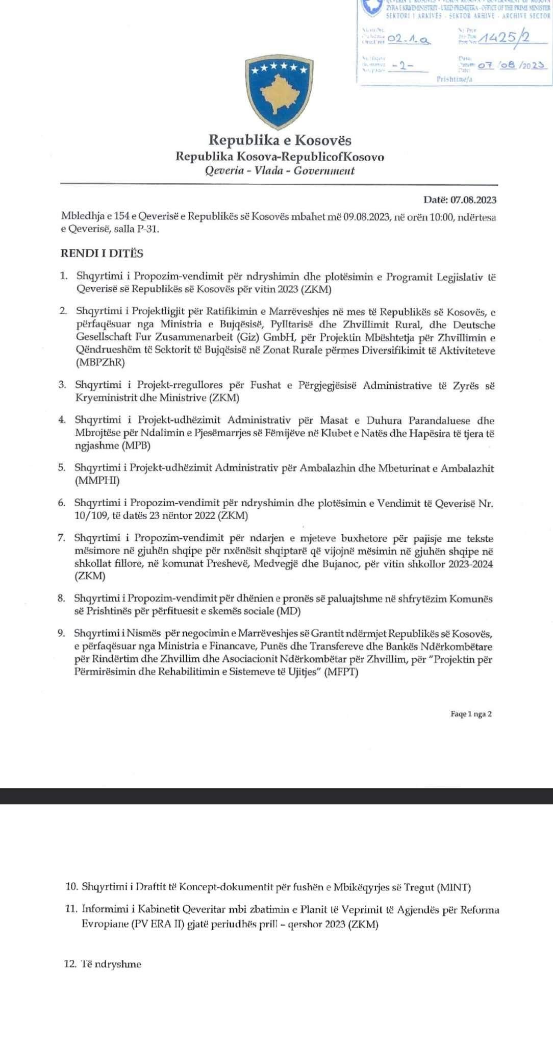 Qeveria e Kosovës sot do të mbajë mbledhjen e 154 ku pritet të shqyrtohen 12 pika të rendit të ditës.