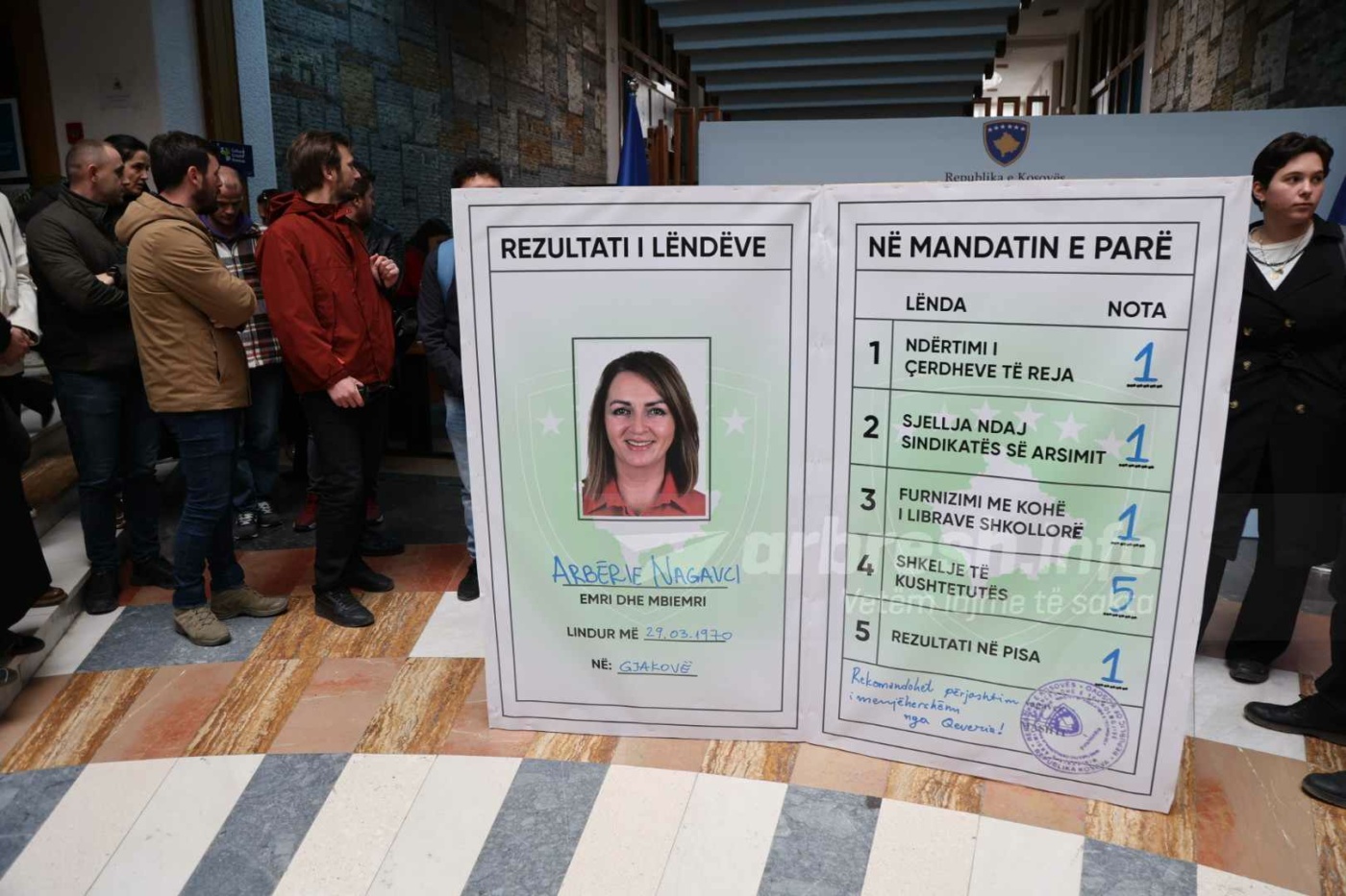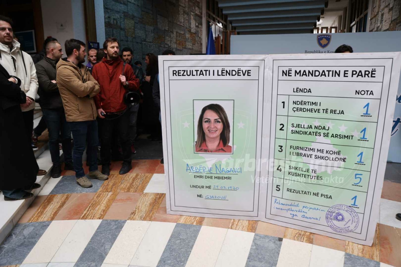 Në pankartat e tyre shihet një librezë shkollore për ministren Nagavci.