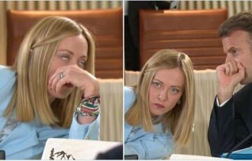 • Kamera kap momentin kur Meloni rrotullon sytë ndërsa Macron i pëshpërit diçka, ...