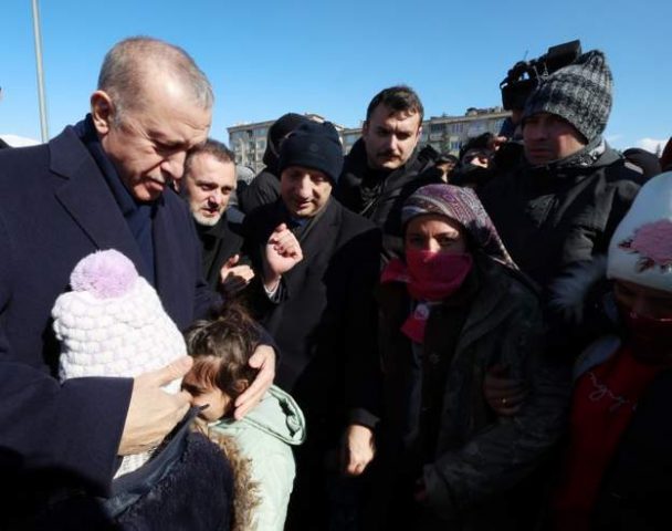 Presidenti turk Recep Tayyip Erdogan ka takuar të mbijetuarit e tërmetit gjatë vizitës në qytetin e Kahramanmaras pas tërmetit të së hënës.