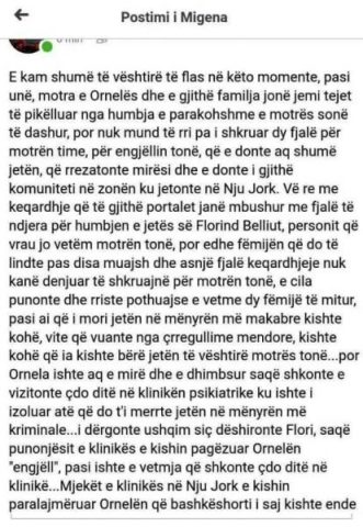 Vë re me keqardhje që të gjithë portalet janë mbushur me fjalë të ndjera për humbjen e jetës së Florind Belliut, personit që vrau jo vetëm motrën tonë, por edhe fëmijën që do të lindte pas disa muajsh dhe asnjë fjalë keqardhjeje nuk kanë denjuar të shkruajnë për motrën tonë, e cila punonte dhe rriste pothuajse e vetme dy fëmijë të mitur, pasi ai që i mori jetën në mënyrën më makabre kishte kohë, vite që vuante nga çrregullime mendore, kishte kohë që ia kishte bërë jetën të vështirë motrës sonë, por Ornela ishte aq e mirë dhe e dhimbsur saqë shkonte e vizitonte çdo ditë në klinikën psikiatrike ku ishte i izoluar atë që do t’i merrte jetën në mënyrën më kriminale…i dërgonte ushqim siç dëshironte Flori, saqë punonjësit e klinikës e kishin pagëzuar Ornelën ‘engjëll’, pasi ishte e vetmja që shkonte çdo ditë në klinikë…Mjekët e klinikës në Nju Jork e kishin paralajmëruar Ornelën që bashkëshorti i saj kishte ende probleme…”, shkruan ndër të tjera motra e 28-vjeçares.