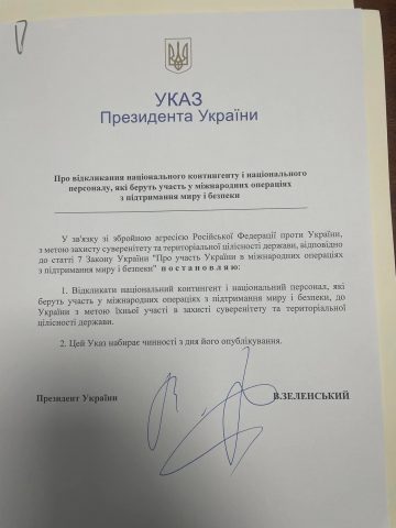 Presidenti i Ukrainës, Zelensky urdhëroi tërheqjen e trupave ukrainase nga të gjitha misionet paqeruajtëse në botë, po ashtu ka urdhëruar edhe tërheqjen e të gjitha pajisjeve.