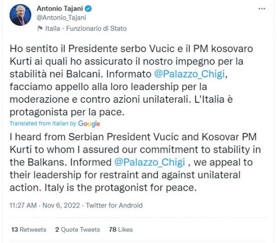 “Kam biseduar me Aleksandër Vuçiqin dhe Albin Kurtin, të cilëve ia sigurova përkushtimin tonë për stabilitetin në Ballkan. Në koordinim me Kryesinë e Këshillit të Ministrave, i bëjmë thirrje udhëheqjes së tyre për përmbajtje dhe kundër çdo veprimi të njëanshëm. Italia është protagoniste për paqen”, ka shkruar Tajani në një postim në Twitter.