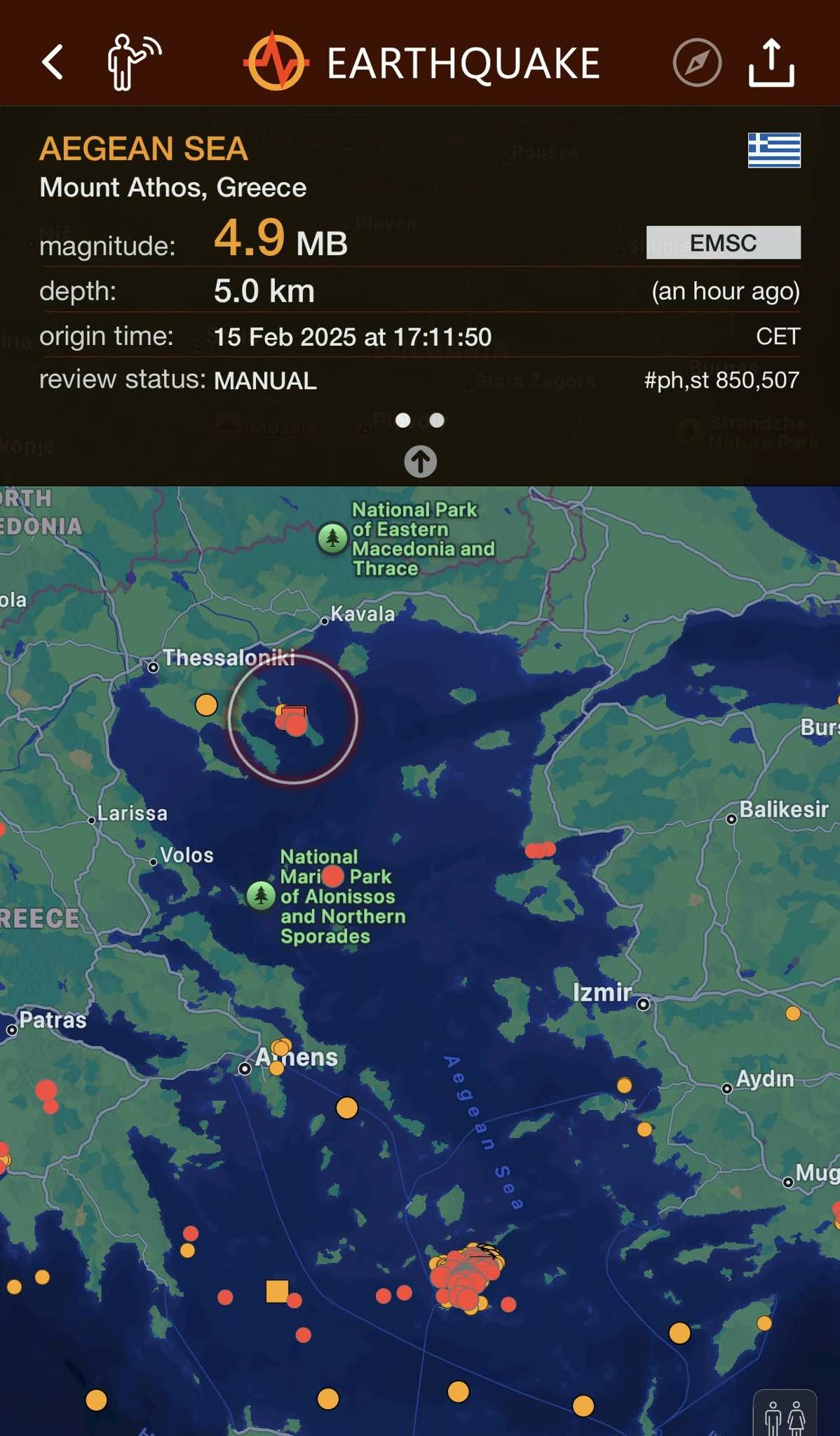Sipas Institutit Gjeodinamik, epiqendra e tërmetit ishte 12 kilometra në perëndim-veriperëndim të Karyas me një thellësi fokale 12 kilometra.