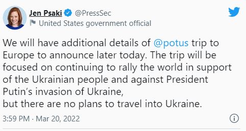 Sekretarja e shtypit e Shtëpisë së Bardhë, Jen Psaki, tha se nuk ka “nuk ka plane” që presidenti amerikan Joe Biden të udhëtojë në Ukrainë këtë javë ndërsa ai shkon në Evropë për samite të parakohshme urgjente.