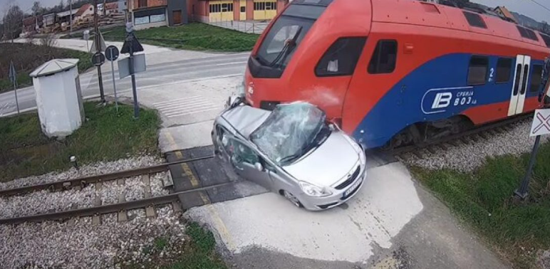 Pamje shqetësuese janë shfaqur në rrjetet sociale ku shihet se si një tren me shpejtësi të plotë godet një veturë “Opel” në fshatin Popuçke, Serbi.