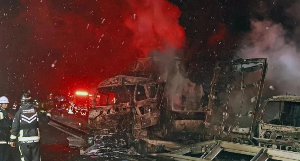 Përplasja fillestare bllokoi pjesë të autostradës dhe veturat që vinin nga pas tyre nuk ishin në gjendje të frenonin në sipërfaqen me dëborë. Një zjarr shpërtheu në skajin më të largët të aksidentit, duke u përhapur në 20 automjete, disa prej të cilave u dogjën plotësisht.