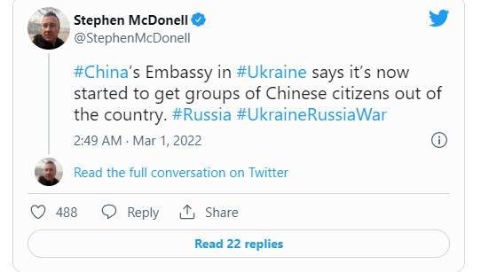 “Ambasada e Kinës në Ukrainë thotë se tani ka filluar të nxjerrë grupe të qytetarëve kinezë jashtë vendit. #Rusi #UkrainëLufta e Rusisë”, ka shkruar ai në Twitter.