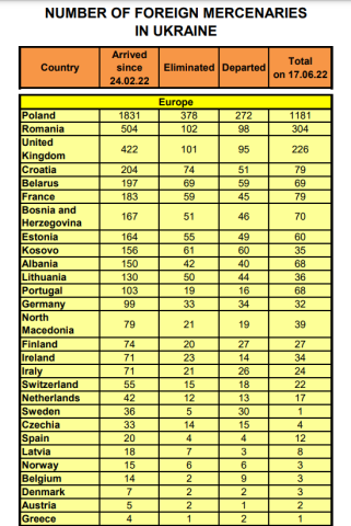 Në një tabelë të postuar në rrjetin social “Facebook” mund të shihet se 150 mercenarë janë nga Shqipëria dhe 156 nga Kosova.