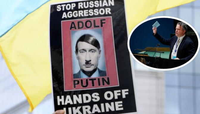 Ambasadori i shtetit të Ukrainës në Organizatën e Kombeve të Bashkuara, Segiy Kyslytsya, gjatë fjalimit të tij e ka krahasuar presidentin rus, Vladimir Putin me diktatorin gjerman Adolf Hitler.