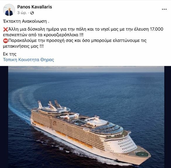 Postimi në Facebook, ku Panos Kavallaris njofton mbërritjen e 17 mijë turistëve përnjëherësh ka shkaktuar reagime të ashpra nga banorët e Santorinit dhe politika në Greqi.