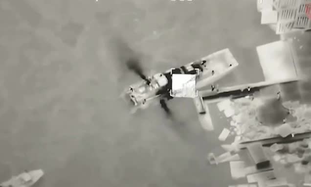Në videon e publikuar nga ushtria e Ukrainës pretendohet se droni Bayraktar TB2 ka goditur anijen e tipit “Raptor” pranë ishullit të “Gjarpërinjve” duke e shkatërruar atë.