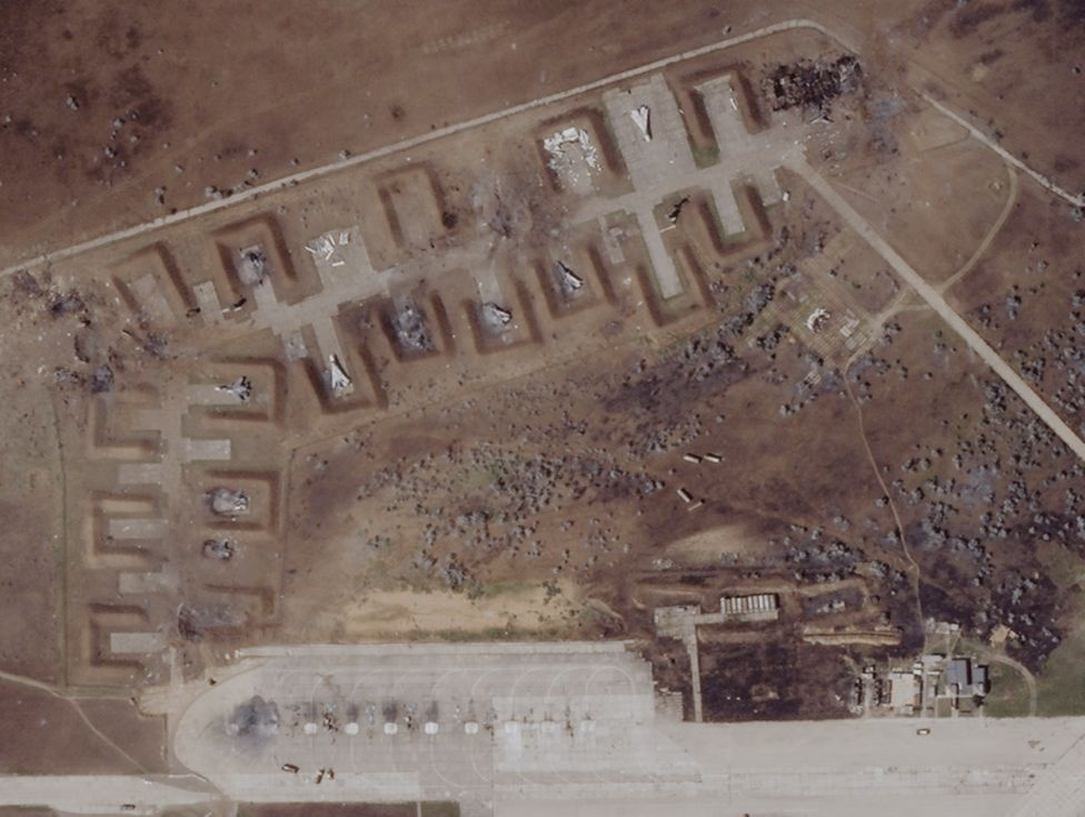 Imazhet satelitore tregojnë dëme të mëdha dhe një numër avionësh luftarakë rusë të shkatërruar në një bazë ajrore në Krime pas shpërthimeve këtë javë.