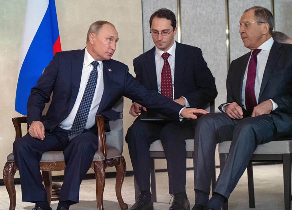 Working visit of Russian President Vladimir Putin to Singapore. Russian President Vladimir Putin (left) and Russian Foreign Minister Sergei Lavrov (right) during a meeting with Japanese Prime Minister Shinzo Abe. November 14, 2018. Singapore, Singapore. Photo credit: Dmitry Azarov/Kommersant/Sipa USA