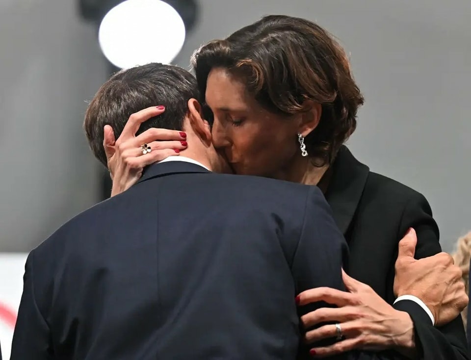 Në imazh, Macron e kap krahun e ministres dhe i afrohet për ta puthur, ndërsa Oudea-Castera i vendos dorën e majtë mbi krahun e tij dhe dorën e djathtë rreth qafës së tij, duke e puthur në faqe pranë veshit.