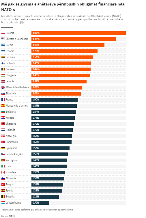 Sipas vlerësimeve të NATO-s nga korriku i vitit të kaluar, 11 vende anëtare pritej ta arrinin synimin e 2 përqindëshit më 2023. Ato ishin: Polonia, Shtetet e Bashkuara, Greqia, Estonia, Lituania, Finlanda, Rumania, Hungaria, Letonia, Britani e Madhe dhe Sllovakia.