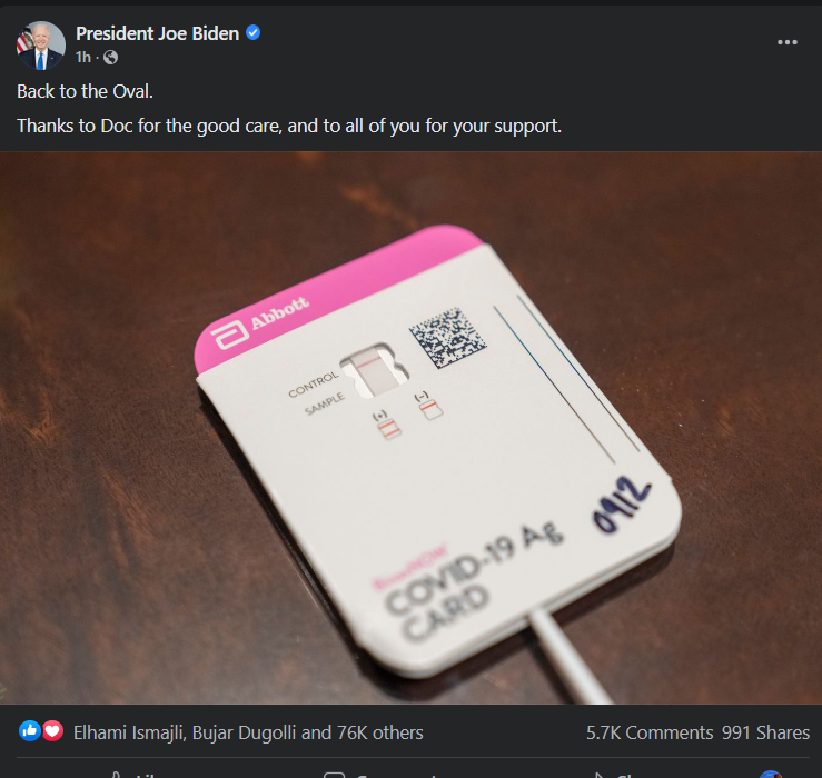 Postimi i Bidenit përfshin një foto të një testi të shpejtë COVID-19, i cili tregon rezultatin negativ pas testimit.