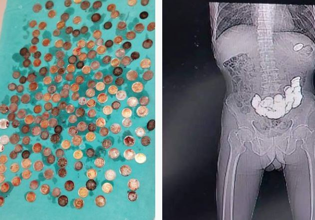 Mjekët u tronditën kur zbuluan se ai kishte gëlltitur mbi 1.5 kg të monedhave gjatë dy deri në tre muajve – duke e lënë atë shumë të fryrë dhe të vjella.