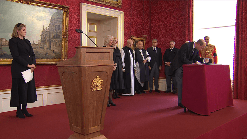 Pas mbledhjes së Këshillit të Aderimit, Princi i Uellsit, Uilliam ishte i pari që nënshkroi shpalljen ndërsa u ndoq nga bashkëshortja e mbretit, Camilla.