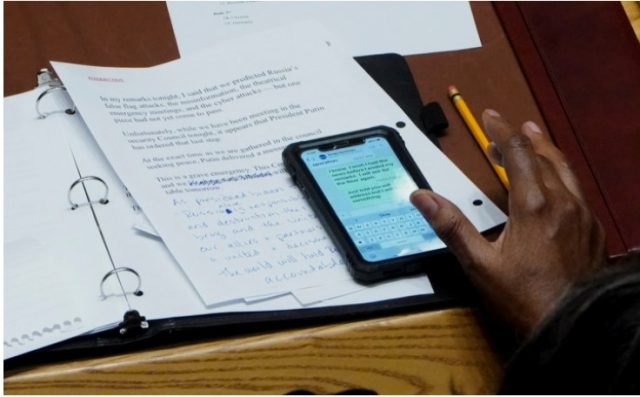 Fotot nga dhoma tregojnë se ajo i dërgoi mesazhe delegatit ukrainas, duke i thënë se “do të doja që ta kisha lajmin përpara se t’i mbaroja fjalët e mia”.