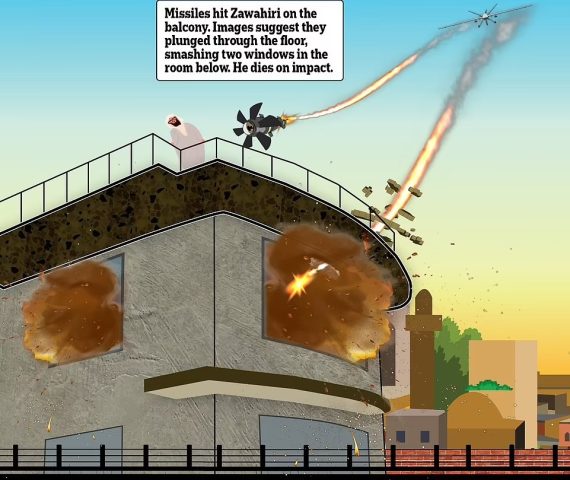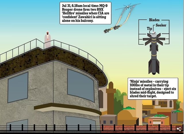 Zyrtari i lartë i administratës për informin gazetarët mbi operacionin, tha se një dron, i tipit MQ-9 Reaper, qëlloi dy raketa AGM-114 Hellfire të njohura si “Ninja” në Zaëahiri ndërsa al-Zaëahir gjendej në ballkonin e një shtëpie të sigurt në lagjen Shirpur në Kabul, ku ai kishte jetuar me anëtarët e familjes së tij, raporton “theaviationist” përcjell arbresh.info.