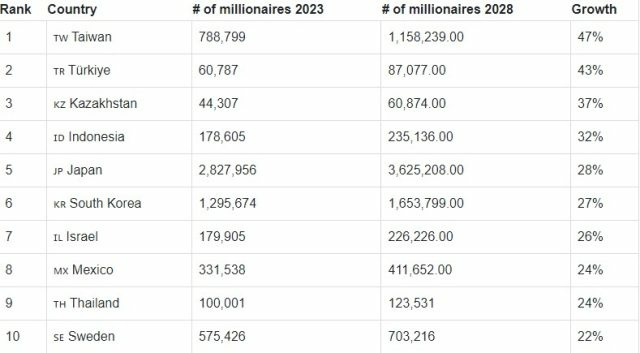 Tajvani kryesoi renditjen e rritjes së milionerëve me një rritje të parashikuar prej 47 për qind të popullsisë së milionerëve të vendit deri në vitin 2028. Raporti parashikon një kërcim të madh në popullsinë e tij milionerësh nga 788,799 në mbi një milion.