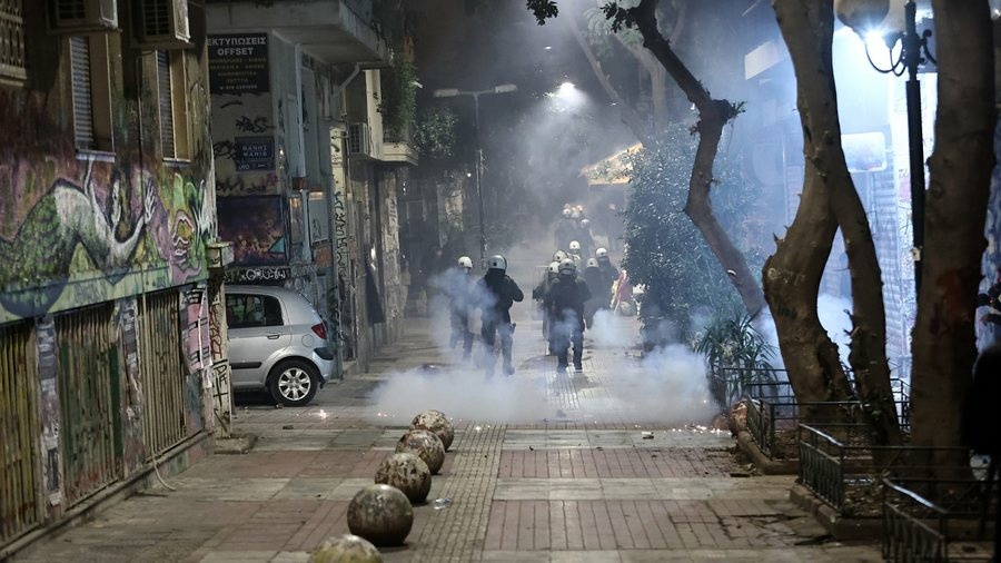 Persona ende të paidentifikuar dhe të maskuar u përplasën me policinë, pak pas mesnate në kryqëzimin Themistokleous me Metaxas, duke hedhur ndaj tyre dhe koktej molotov.