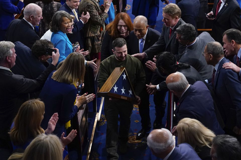 Pasi Zelensky iu drejtua anëtarëve të Kongresit me një fjalim, Pelosi i shtrëngoi dorën Zelenskyt dhe i dhuroi flamurin e SHBA-së.