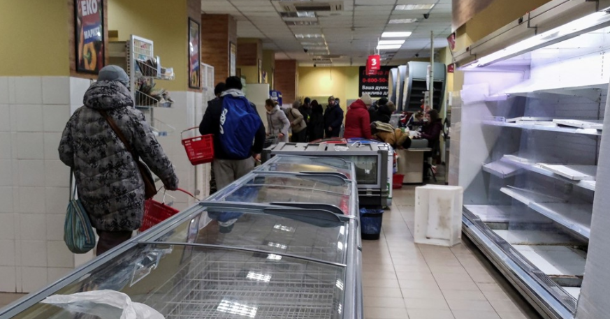 Kjo foto tregon njerëz që qëndrojnë pranë rafteve bosh në një dyqan ushqimesh në qytetin ukrainas të Chernihiv.