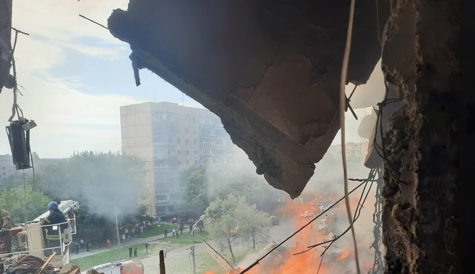 Presidenti I Ukrainës, Volodymyr Zelensky, e postoi një video në Facebook e cila shfaqi tym të zi duke dalë nga një vrimë e madhe e krijuar në fasadën e një blloku banesash.