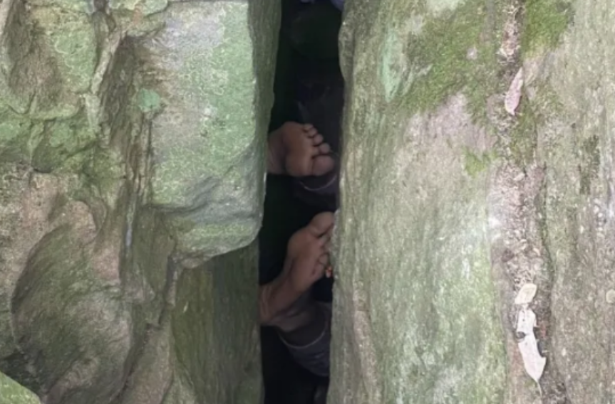 Vetëm këmbët e të resë shihen nga poshtë shkëmbinjve pasi i ishte bllokuar koka për disa orë mes tyre.
