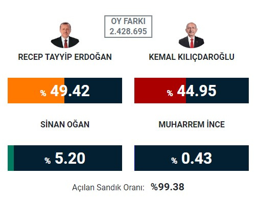 Një konkluzion i tillë mund të nxirret duke u bazuar në të dhënat që kanë nxjerrë mediat turke, sipas të cilave, në 99,38 për qind të votave të numëruara, Erdogan ka 49,42 ndërsa Kilicdaroglu ka 44,95 për qind.