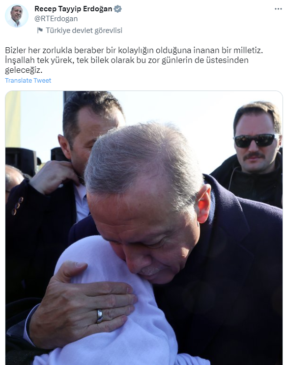 Mesazhi u shpërnda së bashku me një imazh të liderit turk duke përqafuar një grua në skenën e zonës së tërmetit, Erdogan tha: “Ne jemi një komb që beson se me çdo vështirësi ka një lehtësi. Shpresoj t’i kalojmë këto ditë të vështira me një zemër dhe një dore”.