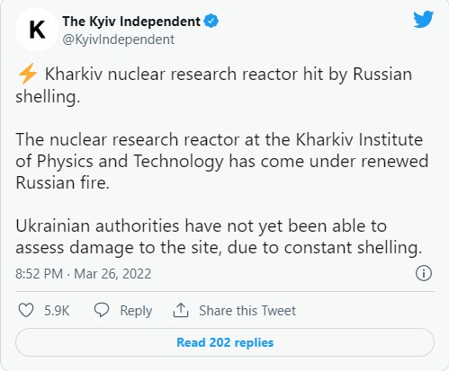Një reaktor kërkimor bërthamor në Kharkiv, qyteti i dytë më i madh i Ukrainës, është goditur nga granatimet ruse, sipas autoriteteve të cituara në një media ukrainase.