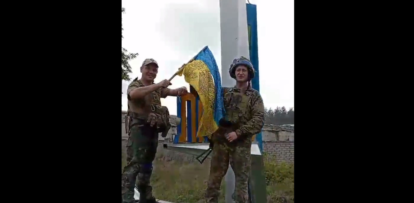 Ukraine’s armed forces raising the blue and yellow flag above the #Lyman entrance sign on the outskirts of the city. “Stabilisation measures” are being carried out, eastern command says, amid reports that around 5000 Russian soldiers remain trapped inside pic.twitter.com/xWnp4YbkX7
