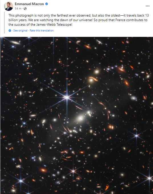 “Kjo fotografi nuk është vetëm më e largëta e vëzhguar ndonjëherë, por edhe më e vjetra – ajo udhëton 13 miliardë vjet mbrapa. Ne jemi duke parë agimin e universit tonë! Jam shumë krenar që Franca kontribuon në suksesin e Teleskopit James-Webb”, ka shkruar Macron në Facebook.