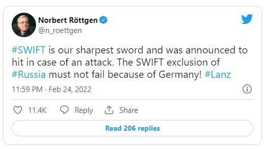 Kreu i komitetit të punëve të jashtme të Bundestagut, Norbert Röttgen, po i kërkon Gjermanisë të mendojë përsëri për Swift. Së bashku me Francën dhe Italinë, Gjermania favorizon atë që diplomatët më të ashpër të BE-së e quajnë një qasje “rritëse” ndaj sanksioneve./arbresh.info/