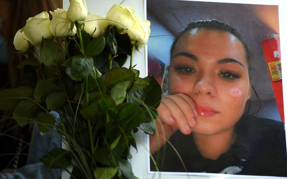 Fotografi e bërë më 26 maj 2021 në Hayange, Francë, me portretin e Stephaniet, gruas 22-vjeçare që u vra nga partneri i saj, Liridon Berisha. Foto: AFP
