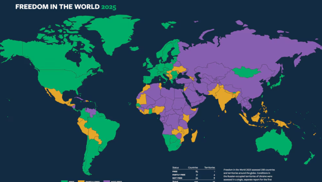 Organizata “Freedom House” tha të mërkurën se liritë politike dhe civile kanë shënuar përkeqësim në vitin e fundit në gjashtëdhjetë shtete në botë, ndërkaq situata është përmirësuar në vetëm 34 prej tyre. Sipas organizatës, mbi 40 për qind e popullsisë së botës janë të prekur nga ky përkeqësim në vitin 2024, që shënon edhe vitin e 19 të kësaj prirjeje në nivel botëror.
