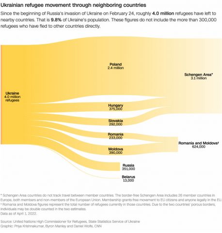 Gati 10% e popullsisë totale të Ukrainës është larguar nga vendi i shkatërruar që kur Rusia pushtoi më 24 shkurt, me afro 4 milionë refugjatë që kërkojnë siguri në vendet fqinje evropiane, shkruan CNN, transmeton arbresh.info.